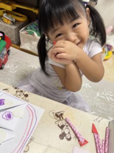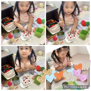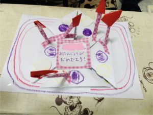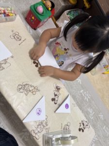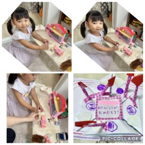 保育のようす 未分類 ねえねの誕生日にケーキを製作しています❤️ ねえねはブドウが好きだからぁ〜🍇 お皿に、可愛いシールを選んで、丁寧に貼っていく〜 折り紙をくるくる巻いてロウソクを作るよ 5歳だから5本ロウソクを立てていく〜🕯️ 火は赤色だから、、赤の折り紙はあるかな〜 みっけ! 想いが詰まった 特別なケーキ🍰 素敵な一年になるといいね🎉